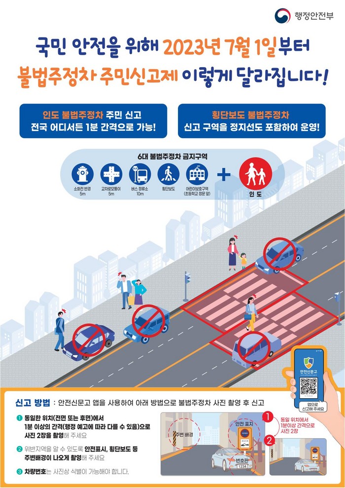 기존 신고 대상 구역은 ▶소화전 반경 5m 이내 ▶교차로 모퉁이 5m 이내 ▶버스정류소 10m 이내 ▶횡단보도 ▶어린이 보호구역 중 초등학교 정문 앞 도로이다. 위 5개 구역에 올해 7월부터 ‘인도’가 추가됐다.