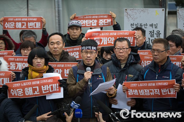 (서울=포커스뉴스) 10일 오후 폭력시위를 주도한 혐의로 수배된 한상균 민주노총 위원장이 피신처인 서울 종로구 조계사를 떠나기 전 기자회견을 하고 있다.