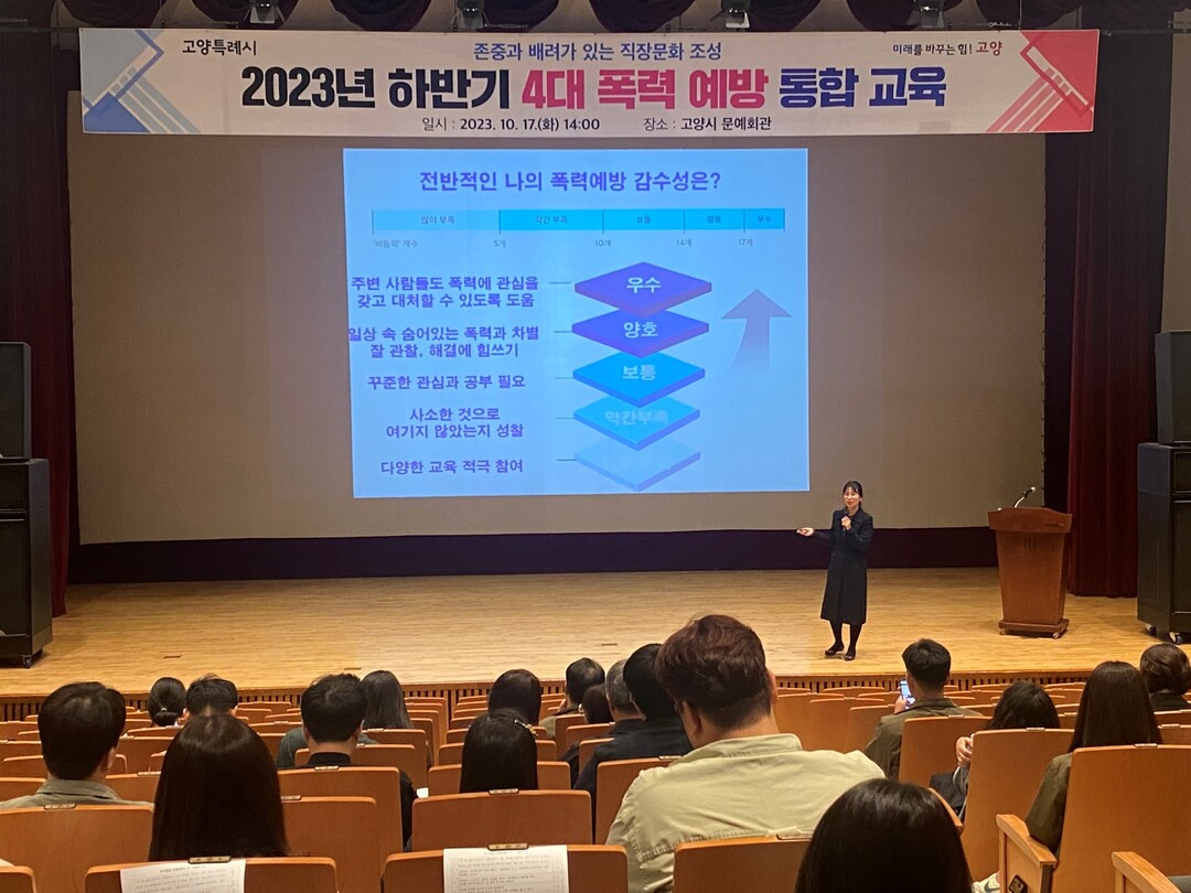 고양시는 직장 내 건전한 성 가치관 확립을 통해 양성평등한 공직문화를 조성하기 위해 매년 4대 폭력(성희롱·성희롱·성매매·성폭력·가정폭력) 예방 교육을 시행하고 있다.