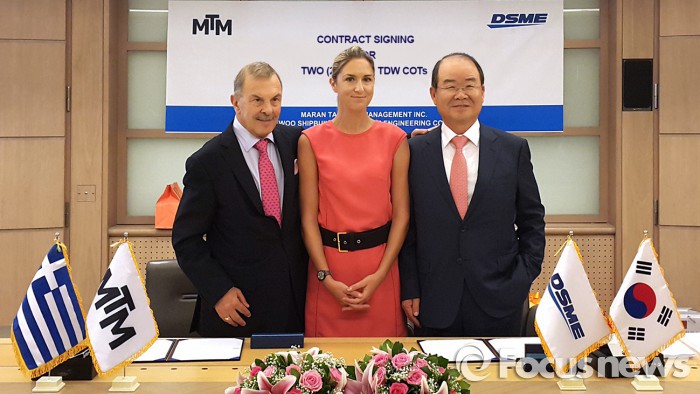 | △ 최근 유럽현지에서 대우조선해양 정성립 사장(오른쪽), 안젤리쿠시스 그룹 존 안젤리쿠시스 회장(왼쪽) 그리고 사주 딸인 마리아 안젤리쿠시스(가운데)가 초대형 원유운반선 건조 계약서에 서명 한 뒤 기념촬영 하고 있다. <사진제공=대우조선해양> |