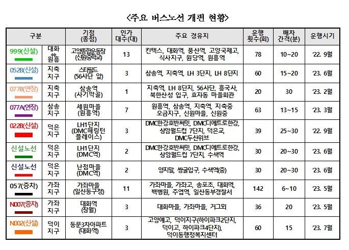지난해 9월에는 덕은지구에서 향동고등학교까지 통학하는 학생들을 위해 서울시와 협의해, 고양시 내를 우회해 향동고로 이어지던 마을버스 022B번이 최단거리인 서울 수색교 부근을 경유하도록 노선을 변경했다. 서울시와 장기간 협의 끝에 오는 6월에는 덕은지구와 현천동에서 DMC역까지 운행하는 2개 노선이 신설될 예정이다.