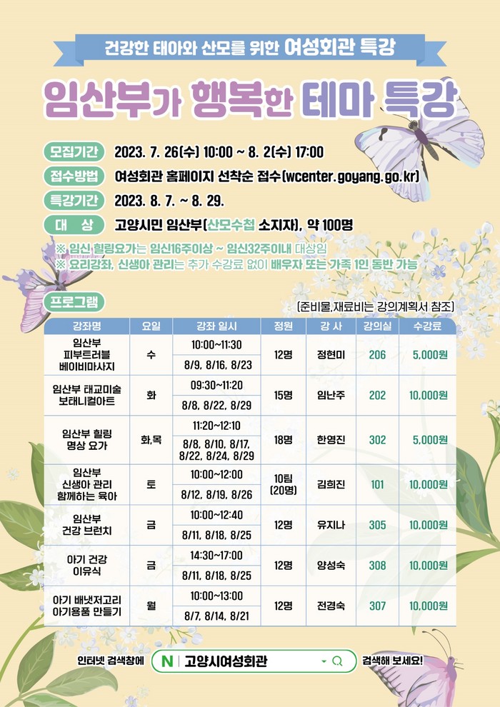 ‘임산부가 행복한 테마특강’은 ▲임산부 태교미술(보태니컬 아트) ▲임산부 피부 트러블(복부튼살, 기미잡티) 관리 ▲베이비마사지 ▲힐링 명상요가 ▲임산부 건강브런치 ▲아기 건강이유식 ▲아기 배냇저고리 만들기 ▲신생아 케어(목욕시키기, 아빠놀이) 등으로 구성된다. 각 강좌별 수강료는 1만원(일부 5천원이다.)