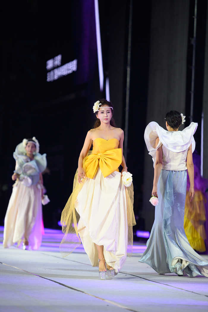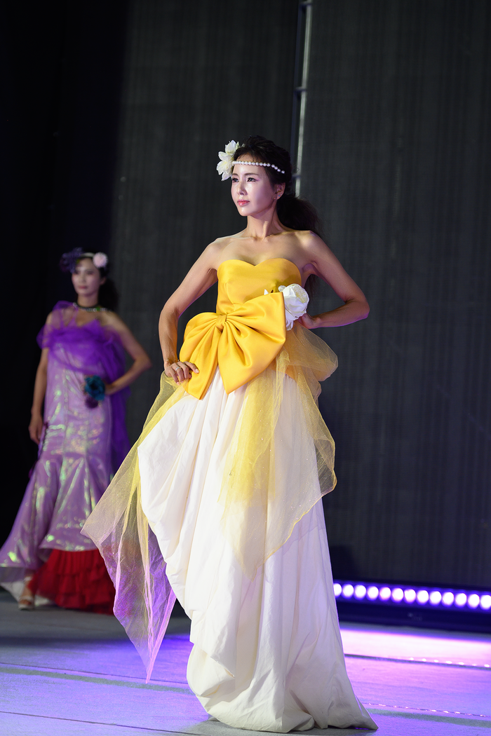 [사진설명] 2022 강남페스티벌 개막제 패션쇼 무대에서 박채린 시니어 모델이 자리를 빛내고 있다.