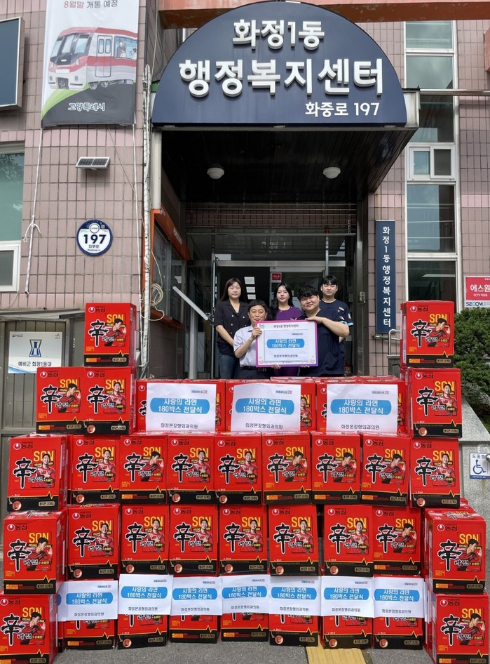 이주훈 화정1동장은 “항상 어려운 이웃들을 먼저 생각하고 나눔을 실천해 주셔서 감사드리며, 관내 기초생활수급자 및 한부모가정 등 어려운 가구에 따뜻한 마음이 담긴 라면을 잘 전달해 드리도록 하겠다.”라고 말했다.