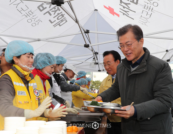 [포항=부자동네타임즈 박윤수 기자]문재인 대통령이 24일 오전 지진 피해 이재민이 머물고 있는 경북 포항시 흥해실내체육관 대피소에서 자원봉사자들에게 오찬 배식을 받고 있다. 2017.11.24.