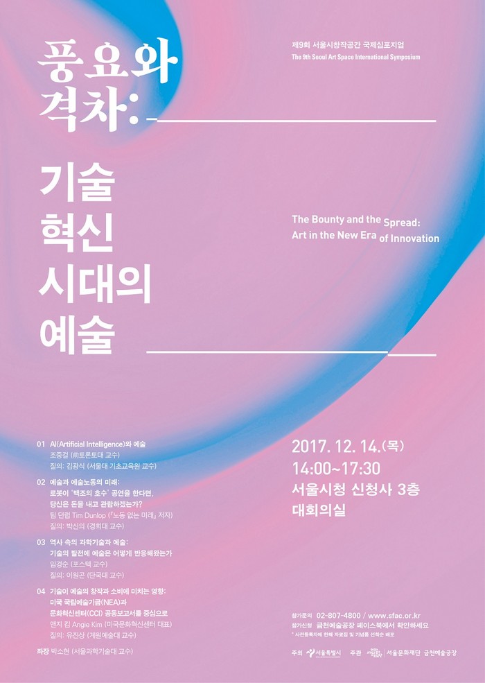 지금까지 ‘4차 산업혁명’에 관한 다양한 논의가 진행되고 있지만, 기술의 진보와 예술의 미래에 대한 막연한 우려 또는 낙관이 주를 이루고 있다. 따라서 보다 생산적이고 실증적인 논의가 필요하다는 인식에 따라 <제9회 서울시창작공간 국제심포지엄>은 예술의 미래와 예술가의 생계에 관한 구체적 예측과 대안을 제시하는 것을 목표로 삼았다.