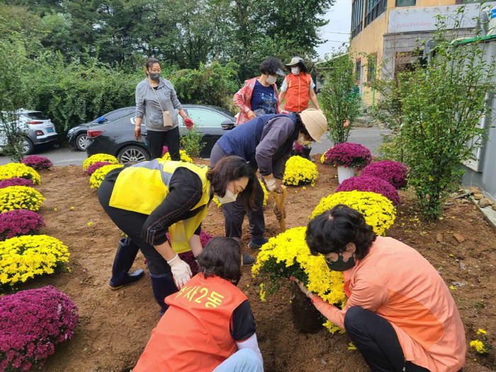 이날 행사에서 마을화단과 도로변 화분, 동행정복지센터 청사 입구에 국화를 식재하여 마을 분위기를 화사하게 바꾸고, 도로변에 무단 투기된 쓰레기 수거 및 잡초 제거 작업도 병행했다.
