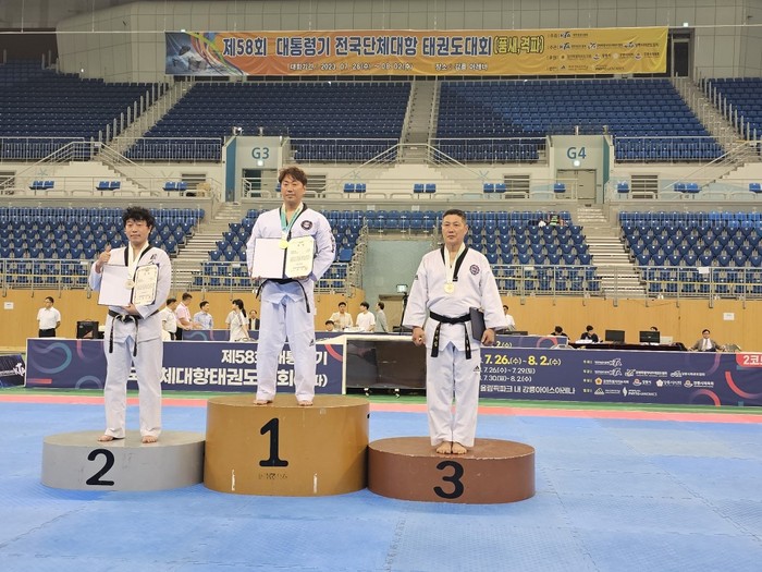 [사진설명] 포티움 태권도 격파 실업팀이 장덕성 금메달울 시상하고 있다.