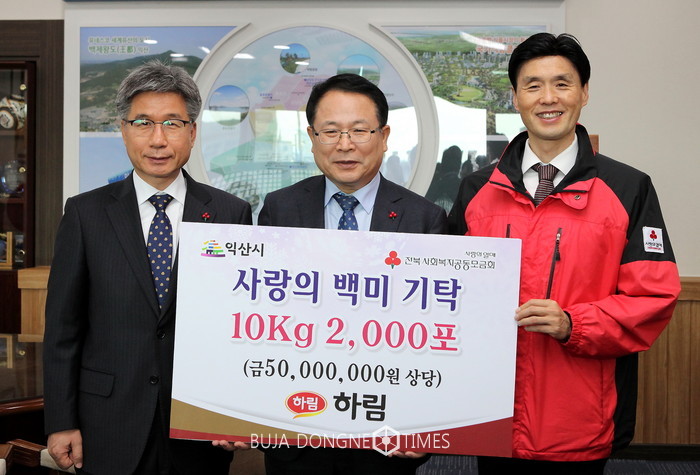㈜하림은 지난 26일 박길연 대표이사를 비롯해 임직원이 익산시청을 방문해 백미 2000포(10kg, 시가 6000만원)를 소외계층을 위해 써달라며 ‘사랑의 쌀’을 기탁했다. 기탁된 백미는 기초생활수급자와 차상위계층, 복지사각지대에 있는 저소득 가구와 익산행복나눔마켓에 지원될 계획이다.