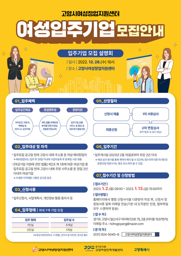 시는 2023년 1월 13일(금) 15시까지 모집을 받는다. 신청은 기한 내 고양시 여성창업지원센터 홈페이지에서 서식을 내려받아 작성한 뒤 이메일로 접수하면 된다.