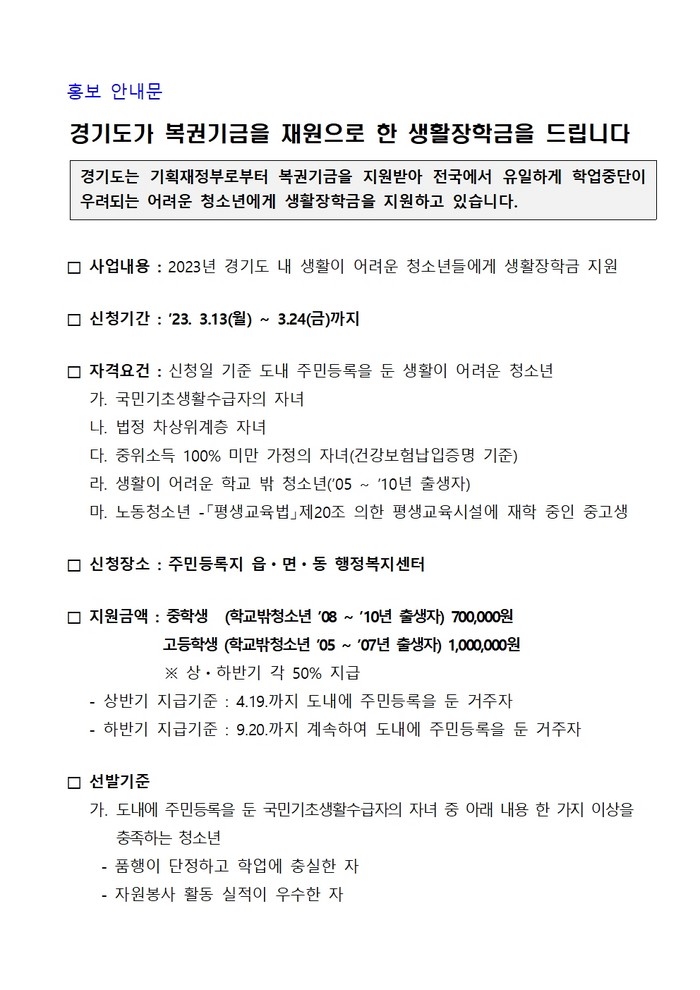 생활장학금은 기획재정부 복권기금을 재원으로 하며, 중학생 700천원·고등학생 1,000천원 지원한다.
