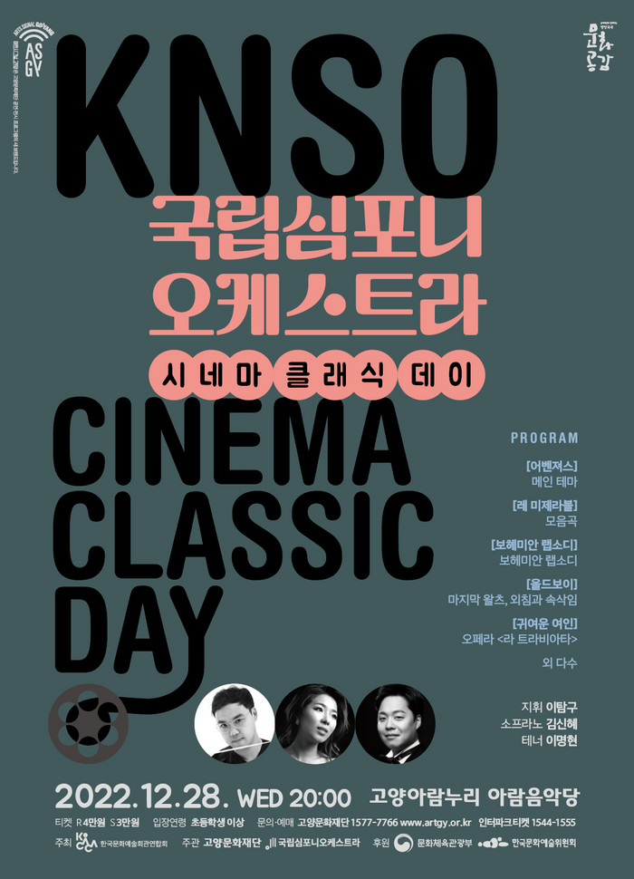 [부자동네타임즈 김인수기자] 고양문화재단(이사장 이동환)은 연말을 맞아 가족과 연인이 함께 즐길 수 있는 국립심포니오케스트라의 시네마 클래식 데이를 오는 28일(수), 고양아람누리 아람음악당에서 선보인다.