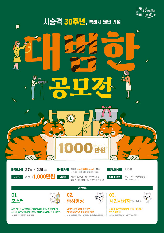 [부자동네타임즈 김인수기자] 고양시가 2022년 고양시 시승격 30주년 및 고양특례시 출범 원년을 맞이해 ‘대범한 공모전’을 개최한다. 공모 주제는 고양시 시승격 30주년과 고양특례시 출범 원년을 기념하기 위한 ①포스터 ②축하영상 ③시민사회자 등 세 개 분야다.