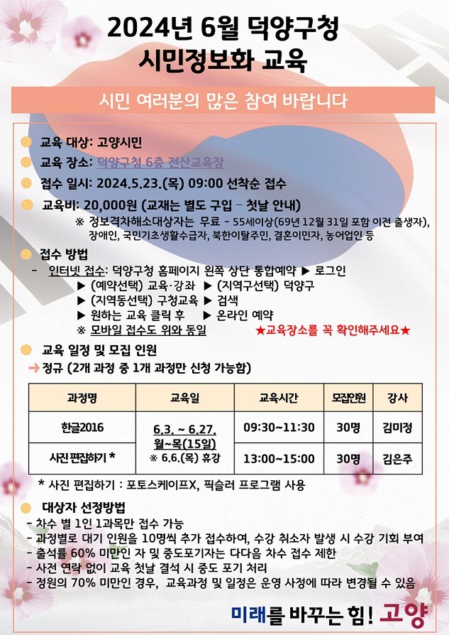 제4차 시민정보화교육은 6월 3일부터 27일까지 주 4일(월~목) 진행되며, ‘한글 2016’과 ‘사진 편집하기’ 과정으로 구성돼 있다.