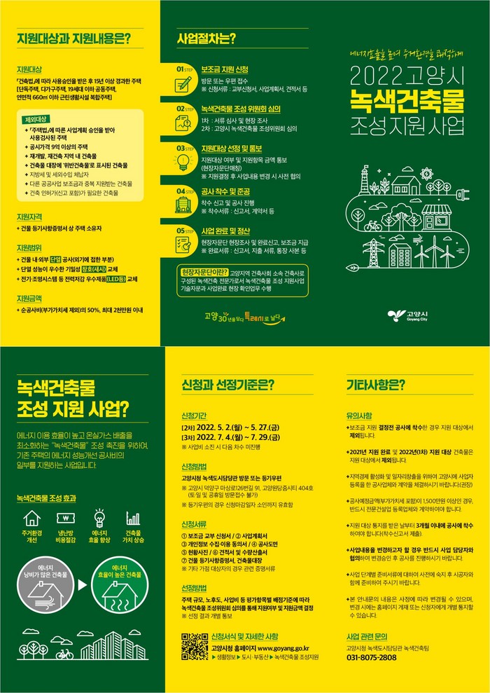 시는 고양시 녹색건축물 조성 지원 조례 개정을 통해 2차 사업부터 지원 대상을 기존 사용승인 후 20년 이상 경과한 주택에서 15년 이상 경과한 주택으로 확대하고, 기초생활수급자 등 에너지 취약계층은 보조금을 20% 범위에서 추가 지원한다.