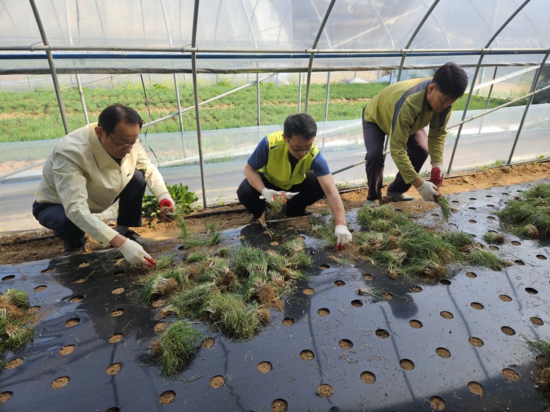 이날 현장에는 마케팅지원부문 김기동 부사장을 비롯한 임직원 30여 명이 참여해 부추 모종 심기와 농가 환경정비 작업을 진행하며 영농철 일손 부족 해소에 힘을 보탰다.