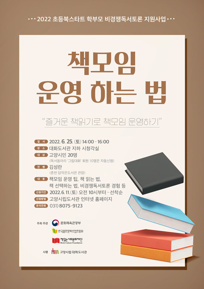 [부자동네타임즈 김인수기자] 고양시 대화도서관이 오는 6월 25일 독서모임 지원 강의 ‘책모임 운영하는 법’을 실시한다.
