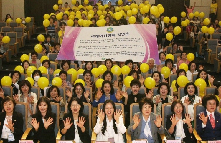 먼저 영상으로 기념사를 전한 윤현숙 대표는 “국제사회가 새롭고 다양한 과제를 마주한 이때 평화를 실현하고 지속하기 위해서는 기존 제도의 변화와 보완이 필요하다”며 ‘DPCW(지구촌 전쟁종식 평화선언문)’와 여성의 연대를 실천 방안으로 제시했다.