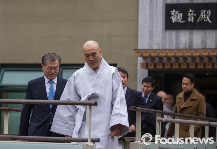 | △ 문재인(왼쪽) 새정치민주연합 대표가 지난달 29일 오후 서울 종로구 조계사를 예방해 조계사 주지스님과 면담 후 화쟁위원회와 회의를 위해 발걸음을 옮기고 있다. <사진제공=포커스뉴스> |