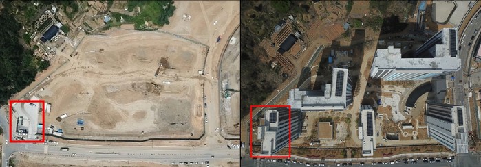 [사진설명] 아파트 공사현장 사무소 (건설 초기(좌), 건설 마무리 단계(우))