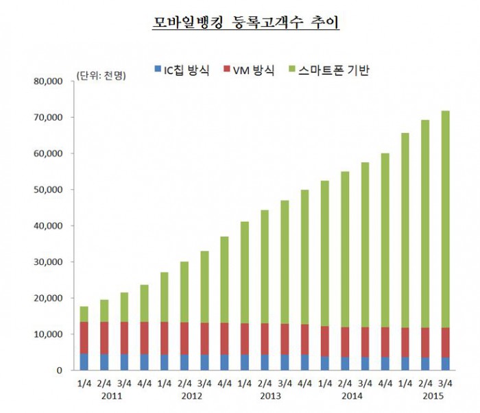 [부자동네타임즈 이현재 기자] 스마트폰 기반 모바일뱅킹(이하 스마트폰뱅킹) 등록고객수가 6008만명을 돌파해 사상 최대치를 기록했다. 반면 PC기반 인터넷뱅킹 등록고객수는 2012년 1분기 이후 감소세를 보이고 있다.
