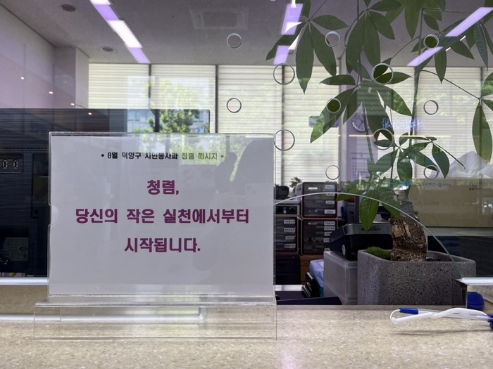 [부자동네타임즈 김인수기자] 고양특례시 덕양구 시민봉사과는 일상생활 속 청렴문화 확산을 위해, 매달 청렴문구를 작성해 구청 민원실에 부착하고 있다.