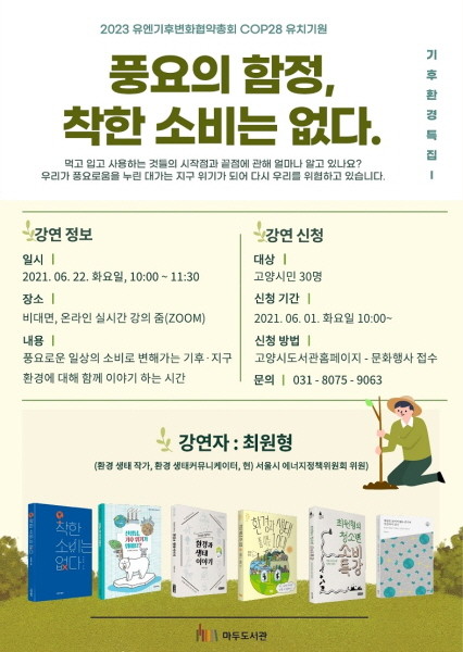 6월 22일에는 최원형 작가의 저서 착한 소비는 없다를 중심으로 ‘풍요의 함정, 착한 소비는 없다’ 강연을 진행한다. 우리가 먹고 입고 사용하는 풍요로움이 지구 위기가 돼 우리를 위협하고 있는 상황에서 ‘어떻게 소비하며 살아야 할지, 지금 우리에게 정말 필요한 생활방식은 무엇인지’에 대해 함께 이야기하는 시간을 갖는다.