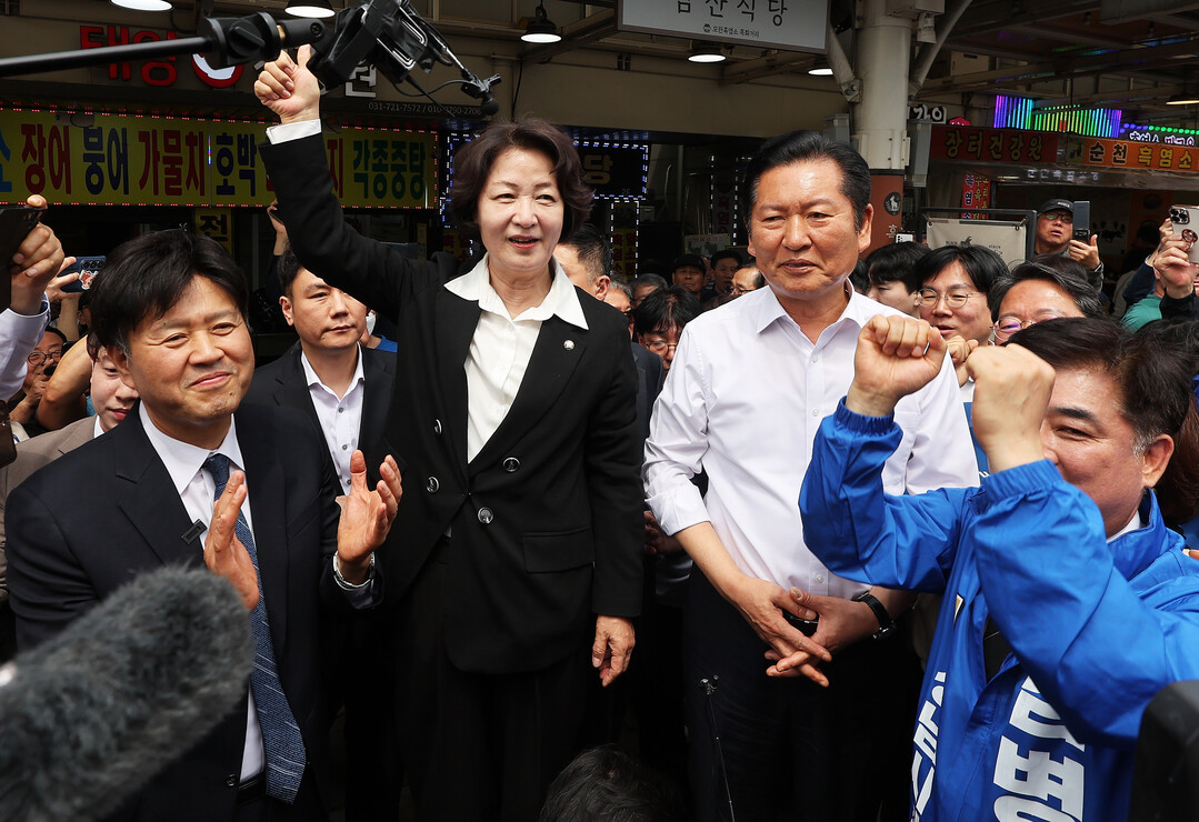 [부자동네타임즈 = 조영재 기자] 더불어민주당 정청래 대표가 추미애 경기도지사 후보, 김병욱 성남시장 후보, 김용 전 민주연구원 부원장 등과 19일 경기도 성남시 모란민속5일장을 방문해 발언하고 있다. 2026.4.19