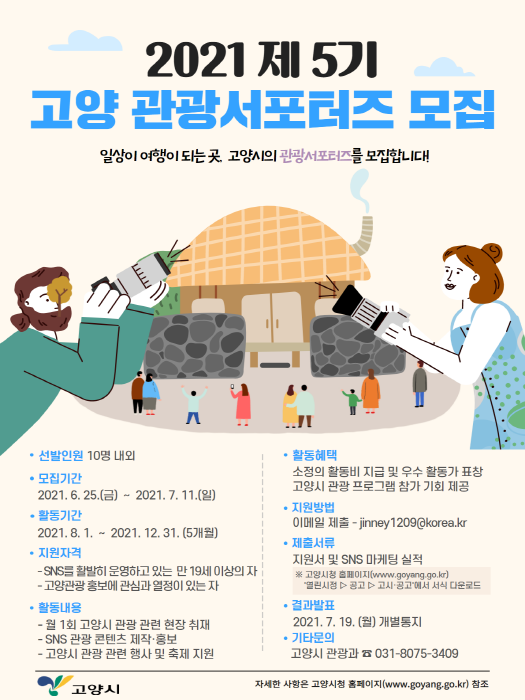 올해로 5기를 맞는 ‘고양 관광서포터즈’는 올해 8월부터 12월까지 5개월간 고양시의 우수한 관광자원을 답사하고, 이를 개인 SNS에 홍보하는 일을 맡는다. 선정된 서포터즈에게는 각종 축제 및 행사 참여 기회도 주어진다.