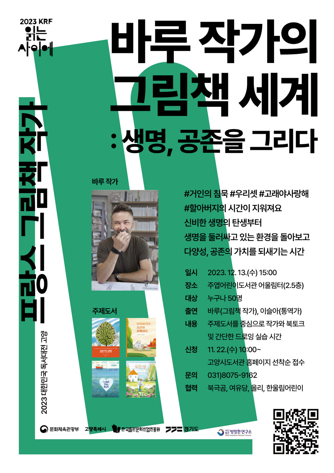 강연은 이슬아 번역가와 함께 바루 작가의 환경 그림책 4종 《거인의 침묵》, 《고래야 사랑해》, 《우리 셋》, 《할아버지의 시간이 지워져요》를 읽어보며 작가의 작품 세계와 철학, 환경과 생명의 가치를 알아보는 시간이 될 예정이다. 또한 어린이를 위한 드로잉 실습도 운영된다.