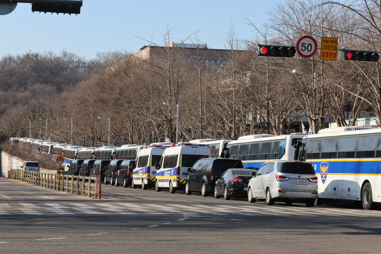 고위공직자범죄수사처가 윤석열 대통령에 대한 체포영장 집행에 나선 3일 정부과천청사 공수처 인근 도로에 경찰버스가 배치돼 있다. 2025.1.3