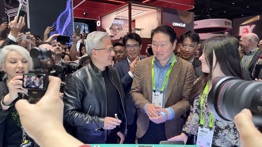황 CEO는 이어 5시30분께에는 SK하이닉스 전시장을 방문했다.그는 최태원 SK그룹 회장과 환담하면서 "여러분들은 완벽하다"며 "당신들이 자랑스럽다"고 덕담을 건넸다.그는 SK하이닉스의 HBM4와 서버용 저전력 메모리 모듈 '소캠2'가 탑재된 베라 루빈 칩 시제품 여백에 '젠슨♡SK하이닉스'라는 글귀를 적고 서명하기도 했다.이번이 GTC 첫 방문인 최 회장은 지난 2월 실리콘밸리에서 황 CEO와 '치맥' 회동을 가진 데 이어 한 달여 만에 다시 만나 파트너십을 이어가게 됐다.