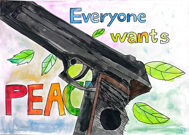 한양의 도화지에는 커다란 권총이 중앙에 있었다. 배경에는 그림의 제목인 ‘Everyone wants peace’가 알록달록한 글씨로 쓰여 있었다. 초록색 잎사귀 여러 개가 그 주변을 감쌌다. 배경은 다양한 색감으로 채워졌다.