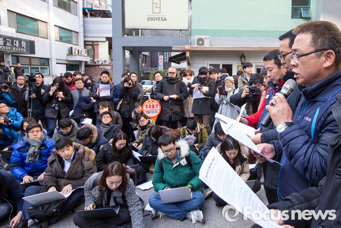 | △ 7일 오전 서울 종로구 조계사 관음전 앞에서 민주노총 지도부가 한상균 위원장의 기자회견문을 대독하고 있다. <사진제공=포커스뉴스> |