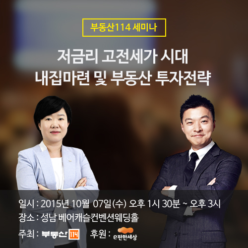 [부자동네타임즈 뉴스팀] 부동산114는 오는 7일 경기 성남시 구미동 베어캐슬컨벤션웨딩홀에서 '저금리·고전세가 시대 내 집 마련 및 부동산 투자전략 세미나'를 개최한다고 2일 밝혔다.
