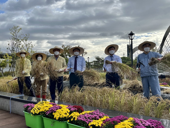 [부자동네타임즈 김인수기자] 고양시가 지난 12일 벼 수확시기를 맞아 국립암센터에 조성한 치유정원 내 친환경 생태 논에서 벼 베기 수확 행사를 진행했다.