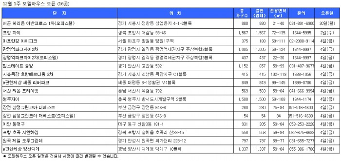 27일 닥터아파트에 따르면 12월 첫째 주 모델하우스는 16곳이 오픈할 예정이다.