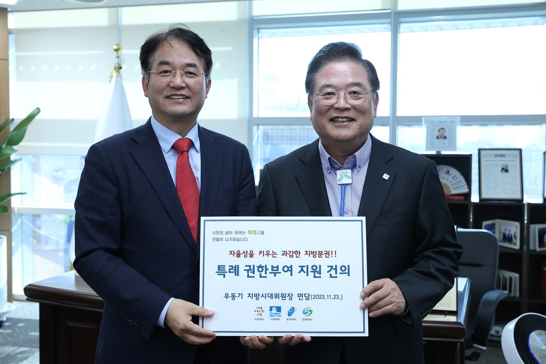 우동기 지방시대위원장은 “지방시대위원회가 지방분권과 국토균형발전이라는 명확한 목표를 가지고 출범한 만큼, 특례시에 많은 권한이 이양될 수 있도록 지원을 아끼지 않겠다”라고 답했다.