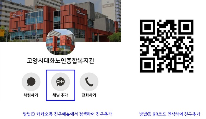 대화노인종합복지관 카카오톡 플러스친구는 카카오톡 친구 검색창에서 ‘고양시대화노인종합복지관검색’을 검색 후 친구 추가 또는 하단의 QR코드를 통해 추가할 수 있다.