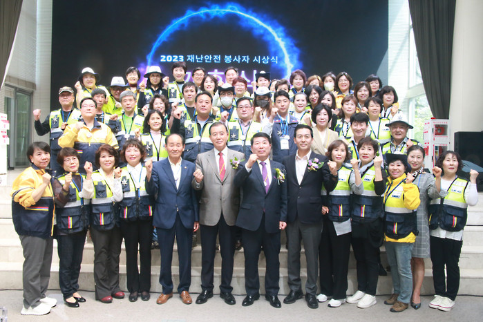 [사진설명] 재난안전보안관 분들이 모여 행사 기념사진을 찍고 있다.