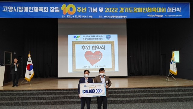 [부자동네타임즈 김인수기자] 고양특례시(시장 이동환)는 지난 22일 사회적 기업 ‘함께하는 우리’가 고양시 장애인체육회에 3,600만원을 후원했다고 전했다.