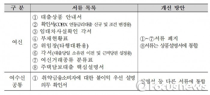 대출신청서, 대출거래약정서 등 반드시 필요한 서류는 유지하되 필요성이 크지 않거나 중복되는 9개 서류는 폐지하거나 통폐합하기로 했다.