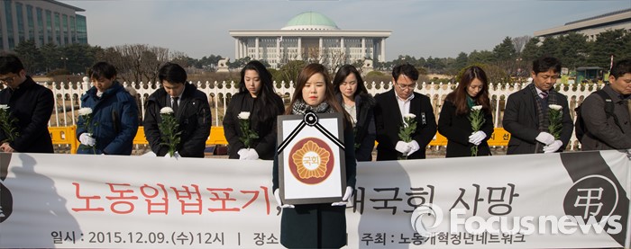 (서울=포커스뉴스) 9일 오후 서울 국회 앞에서 노동개혁청년네트워크 회원들이 '노동입법포기, 19대 국회 사망 기자회견'을 하고 있다.