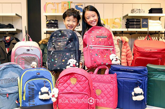 사진은 16일 서울 강남구 소재 타미힐피거 가로수길 직영점에서 아이들이 타미힐피거 키즈 ‘스쿨백 컬렉션'을 소개하고 있는 모습.