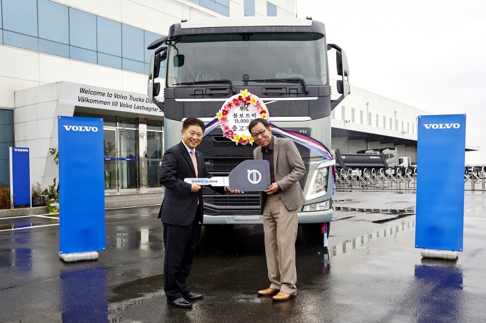 볼보트럭코리아는 1일 평택 볼보트럭 종합출고센터에서 1만5000번째로 출고되는 볼보 FH 트라이뎀 덤프 트럭을 인도받게 될 고객을 초청해 기념식을 가졌다.