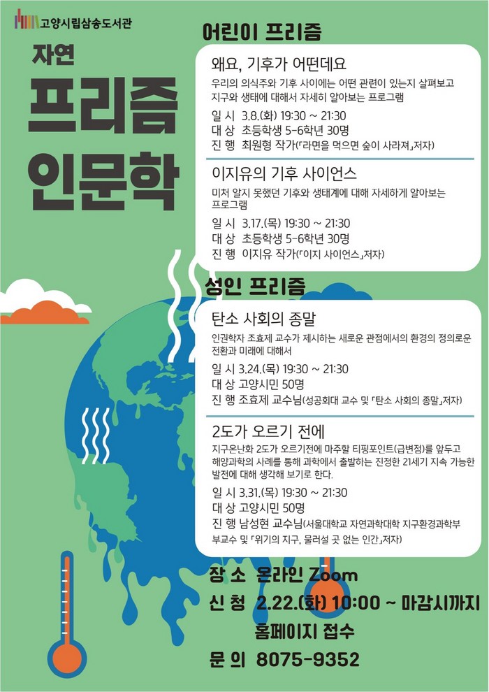 [부자동네타임즈 김인수기자] 고양시 삼송도서관이 ‘지구 환경 수업’이라는 주제로 3월 8일부터 3월 31일까지 올해의 첫 ‘프리즘 인문학’을 운영한다.