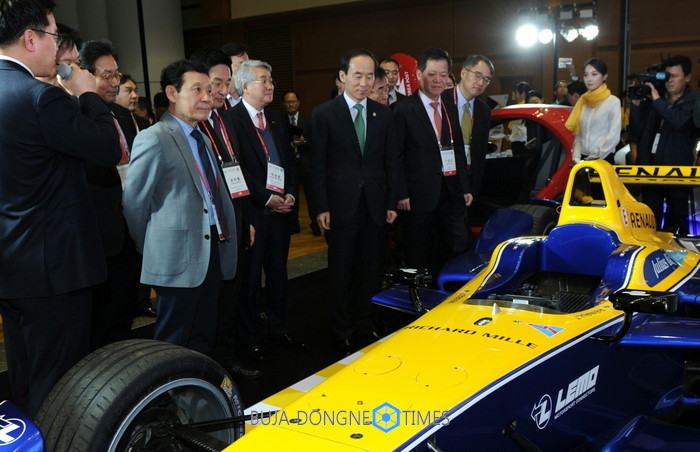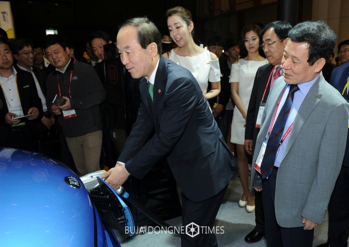 윤장현 광주광역시장은 18일 오후 제주국제컨벤션센터에서 열린 제3회 국제전기자동차엑스포 개막식에 참석해 윤성규 환경부 정관 등과 함께 전시장을 둘러보고 있다.
