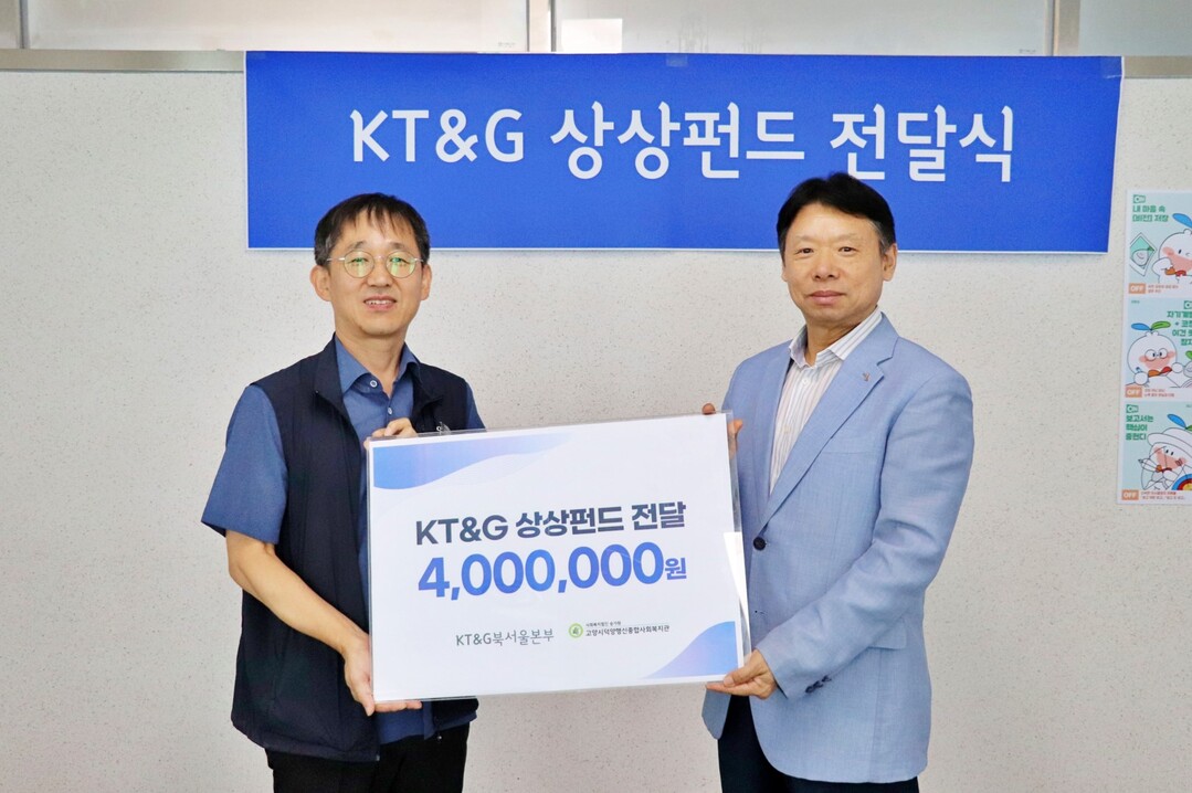 [부자동네타임즈 = 김인수 기자] 케이티엔지(KT&G) 북서울본부가 21일 고양시덕양행신종합사회복지관(관장 김진우)에 상상펀드 후원금 400만원을 전달했다.