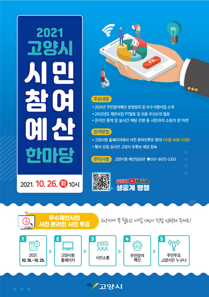 이번 온라인 투표결과는 10월 26일(화) 예정된 ‘2021 고양시 시민참여예산 한마당’ 행사를 통해 공개된다.