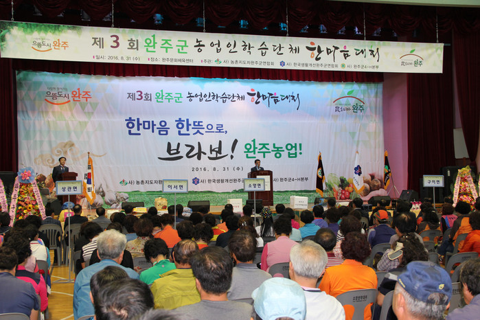 [완주-부자동네타임즈 이정술 기자] 완주군은 지난 8월 31일 완주문화체육센터에서 「한마음 한뜻으로, 브라보! 완주농업!」이란 주제아래 박성일군수를 비롯한 정성모의장, 도의원, 군의원들과 농촌지도자회, 생활개선회, 4-H본부회원 등 500여명이 참석한 가운데 제3회 농업인학습단체 한마음대회를 개최했다.